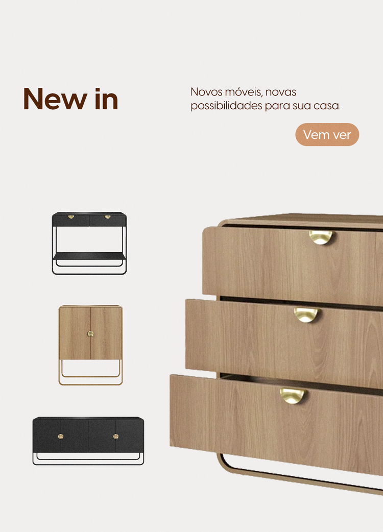 Pronta Entrega41% OFFEstante com Prateleira 3 Gavetas 2 Portas MDF com Aço Voss 75 cm - Freijó c/ Champanhe
