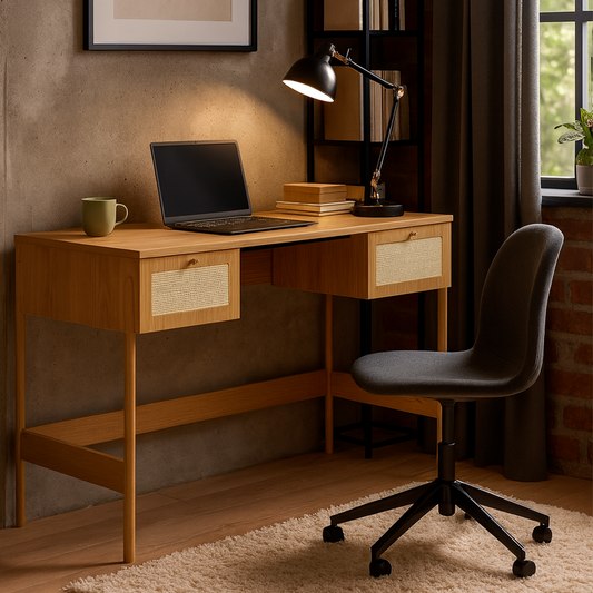 Pronta Entrega36% OFFEscrivaninha com 2 Gavetas Ander 139 cm - Mel c/ Palhinha - Dourado