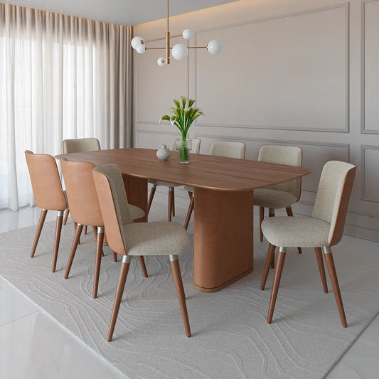 Conjunto de 8 Cadeiras de Madeira Maciça Estofada Dakota - Natural c/ Bouclé Fendi e PU Caramelo - Champanhe