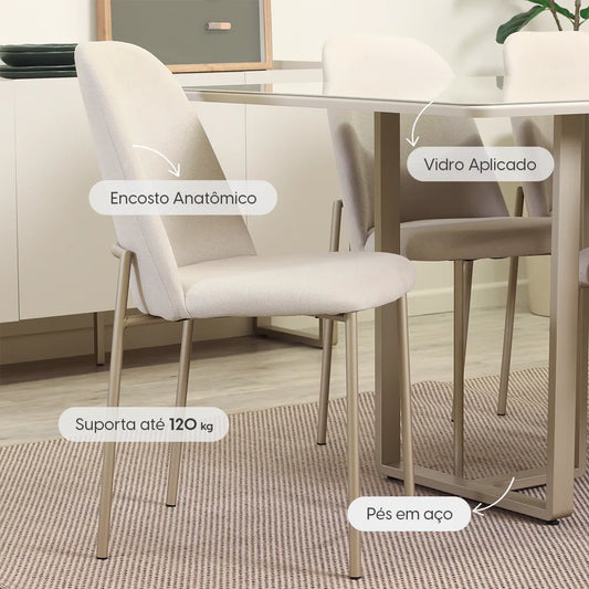 Conjunto de Jantar Mesa Retangular com Vidro Arcádia 6 Cadeiras Lucille - Champanhe c/ Off White - Palha