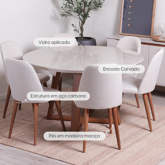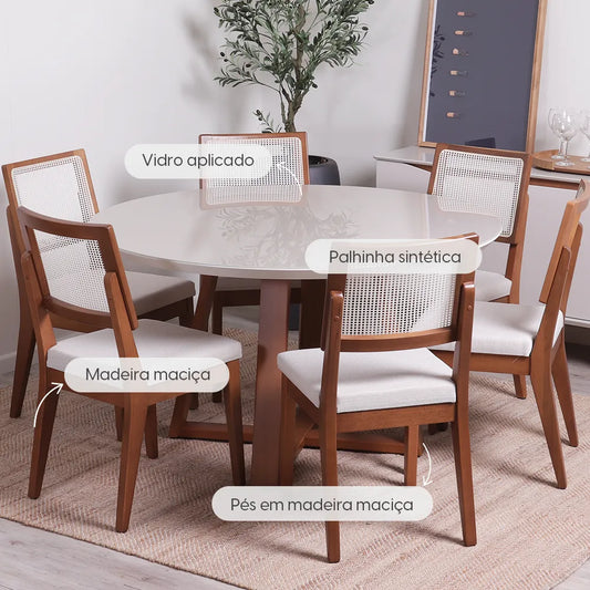 Pronta Entrega25% OFF8% OFF com o cupom: LIQUIDA8Conjunto de Jantar Mesa Redonda com Vidro Bennett 6 Cadeiras New Drop - Natural c/ Off White