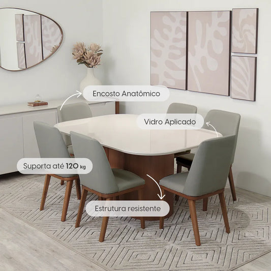 Conjunto de Jantar Mesa com Vidro Avena 6 Cadeiras Megan - Canella c/ Fendi