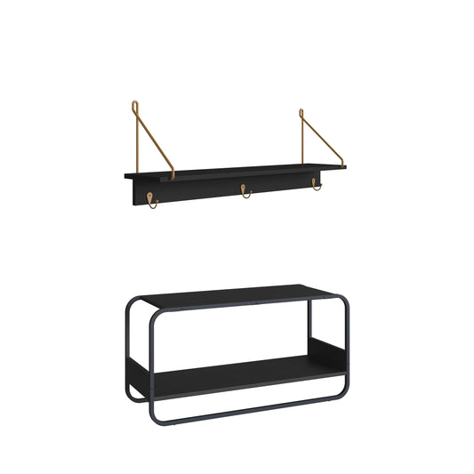 Conjunto Banco 1 Lugar com Prateleira 3 Ganchos Dunna - Preto c/ Dourado