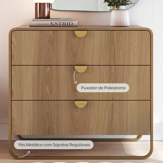 Conjunto 2 Mesas de Cabeceira com 2 Gavetas 1 Nicho e Cômoda Dunna - Mel c/ Dourado