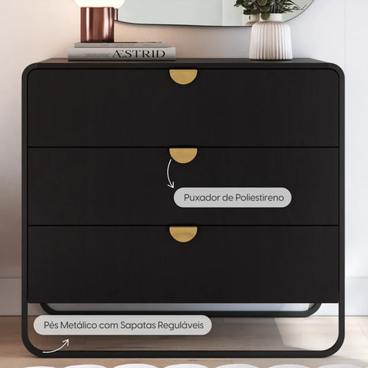 Conjunto 2 Mesas de Cabeceira com 2 Gavetas 1 Nicho e Cômoda Dunna - Preto c/ Dourado