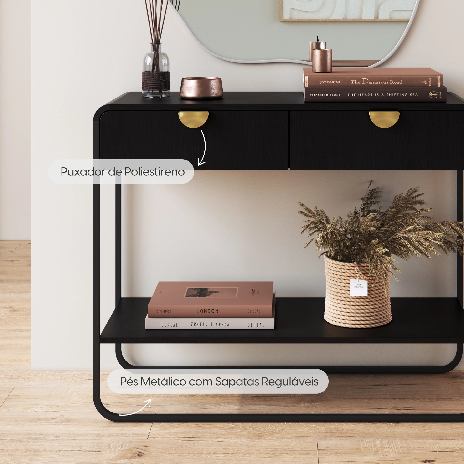 O aparador Dunna oferece praticidade com gavetas e prateleira, trazendo organização e apoio extra para salas, halls, quartos ou escritórios.