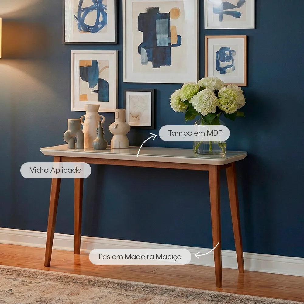 O tampo em MDF com vidro oferece uma superfície estável e fácil de limpar, enquanto os pés em madeira maciça garantem firmeza no uso diário. As linhas retas destacam o formato do móvel e contribuem para um visual organizado. Versátil, o aparador funciona no hall de entrada, sala de estar, sala de jantar, quarto ou escritório, servindo como apoio decorativo ou área de organização. Uma peça prática, que se adapta a diferentes propostas de decoração e colabora para um ambiente bem estruturado.