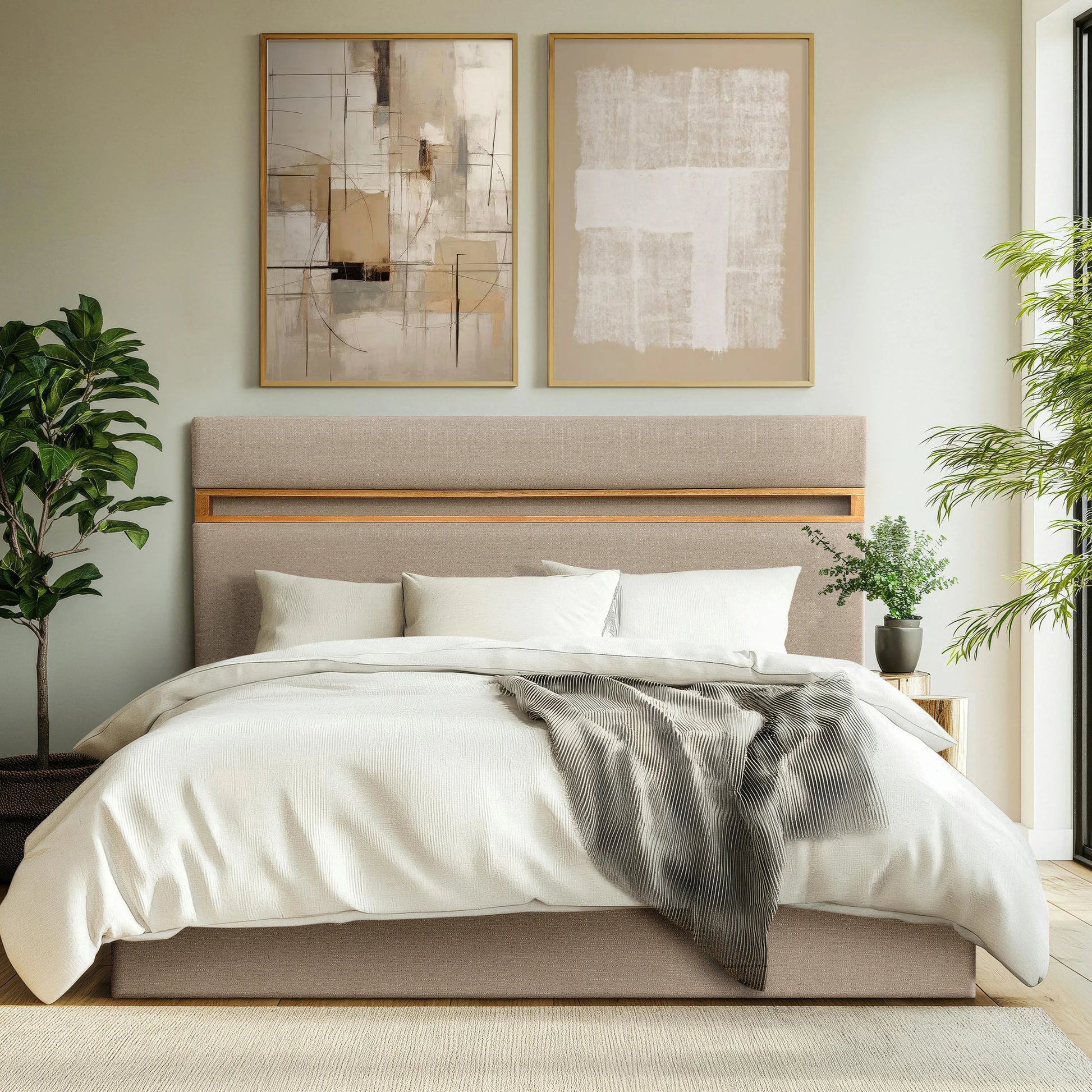 Com design funcional e versátil, a cabeceira estofada Mira, com nicho em madeira, valoriza quartos modernos e acolhedores.