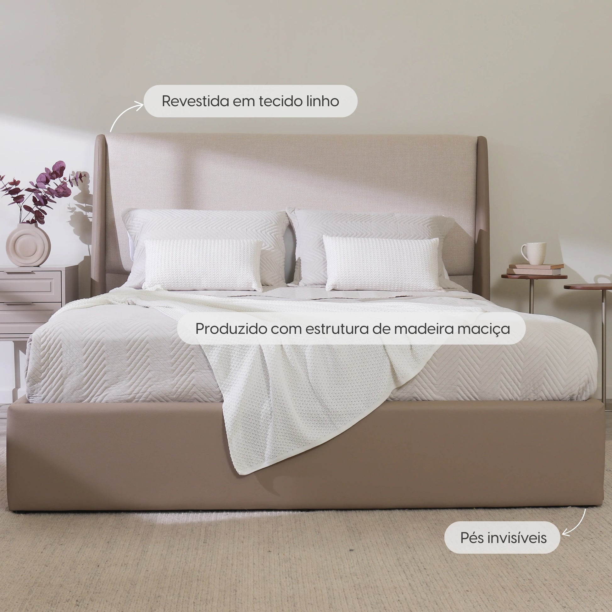 Cabeceira e box com espuma D20 e D16, garantindo conforto e suporte, revestidos em tecido linho com opção em PU.