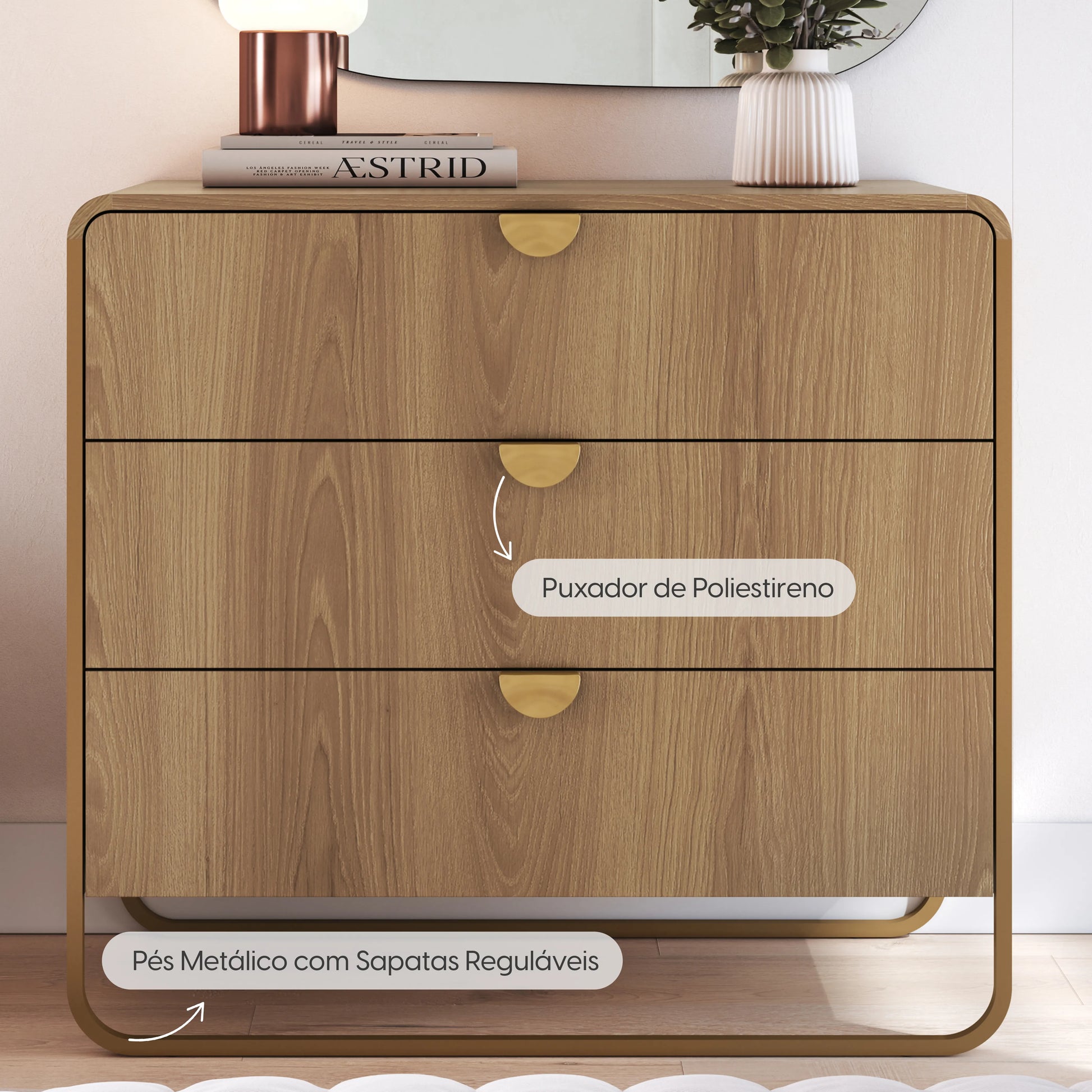 Cômoda com 3 Gavetas Dunna 90 cm - Mel c/ Dourado
