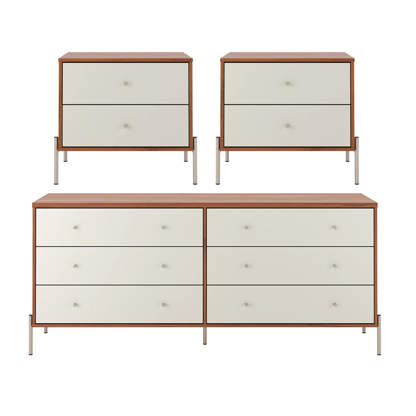 O Conjunto para Quarto Jasper une funcionalidade e estilo para deixar seu espaço mais organizado e acolhedor. As Mesas de Cabeceira contam com duas gavetas espaçosas, ideais para manter livros, acessórios e objetos sempre à mão. Já a Cômoda, com seis gavetas amplas, proporciona armazenamento eficiente para roupas, documentos e outros itens essenciais. O design minimalista é evidenciado pelos pés em aço e pelos puxadores em zamac, garantindo leveza e versatilidade para diferentes ambientes. Seja no quarto, no home office ou até na sala de estar, o Conjunto Jasper se adapta facilmente a diferentes composições, trazendo organização sem abrir mão da estética. Aposte nessa combinação funcional para um dia a dia mais prático e um espaço bem planejado.