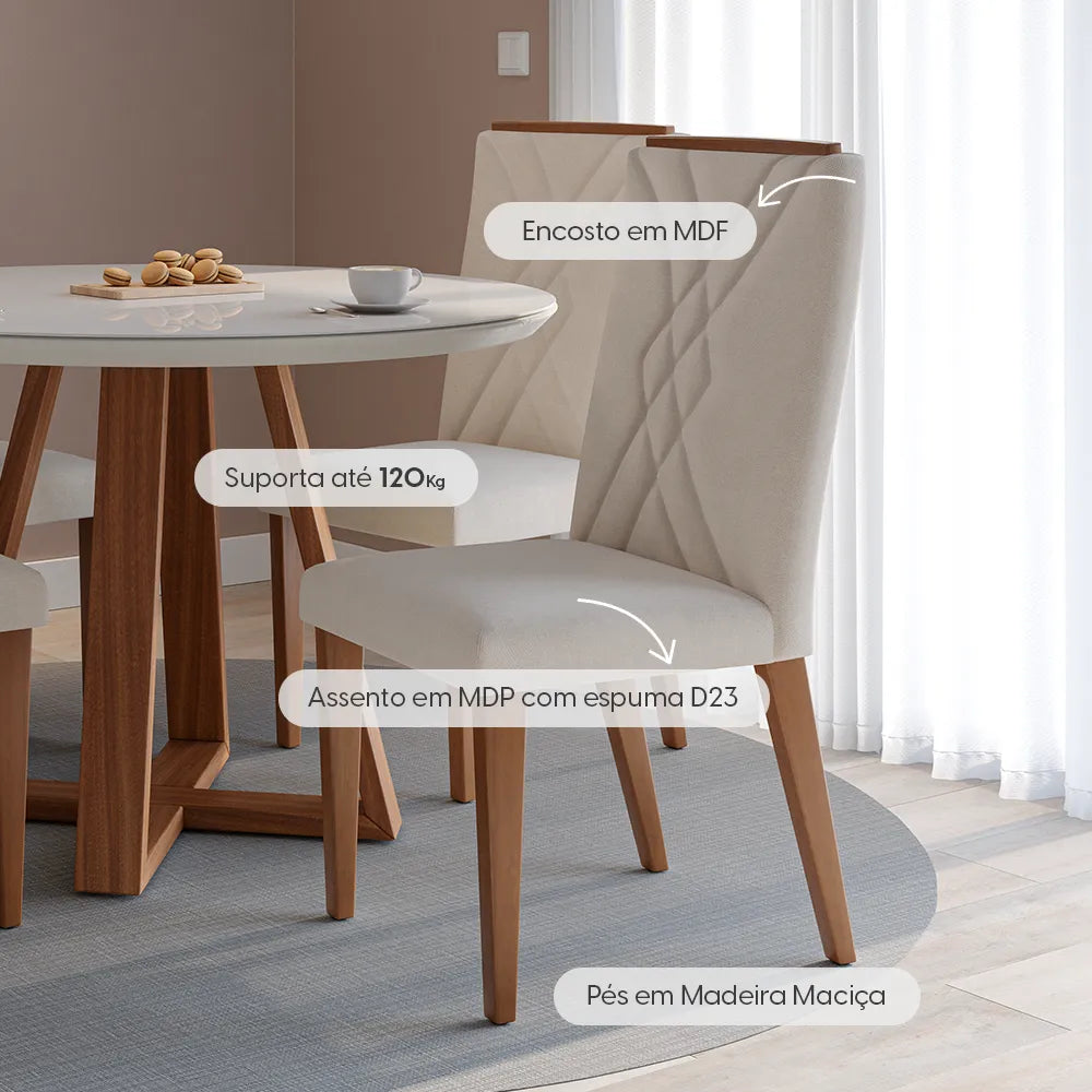 Estofada e revestida em tecido de alta qualidade, o modelo proporciona não apenas um toque de luxo, mas também uma experiência de conforto agradável. O assento e o encosto contínuos decorados com detalhes em matelassê, elevam o seu design, proporcionando um visual refinado e contemporâneo. Seus pés em madeira maciça não apenas conferem durabilidade excepcional, mas também garantem estabilidade para um uso diário confortável. Seja para refeições informais na cozinha, jantares sofisticados na sala de jantar ou momentos descontraídos na área gourmet, a cadeira Megan se destaca como uma peça funcional e esteticamente atraente, combinando estilo e conforto para transformar seus ambientes.