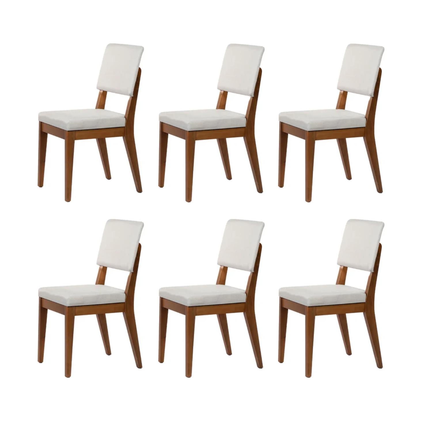 Conjunto de 6 Cadeiras de Madeira Maciça Estofada Ella - Natural c/ Linho Off White