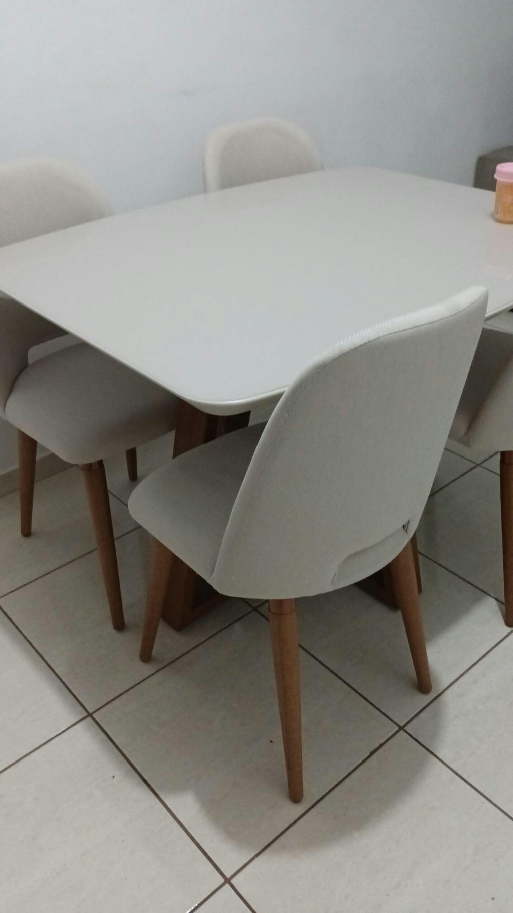 Recomendo o conjunto de mesa, ambos de boa qualidade, igualzinho as fotos e condizente com as avaliações do site. A principio fiquei receosa de compra pelas reclamações da loja no site do reclame aqui, porém não tive problemas na compra, a entrega foi realizada antes do prazo. Tenho apenas uma observação, uma das cadeiras veio com marcas de sujeira, parecendo que foi molhada, por isso não dou nota 5 a compra.