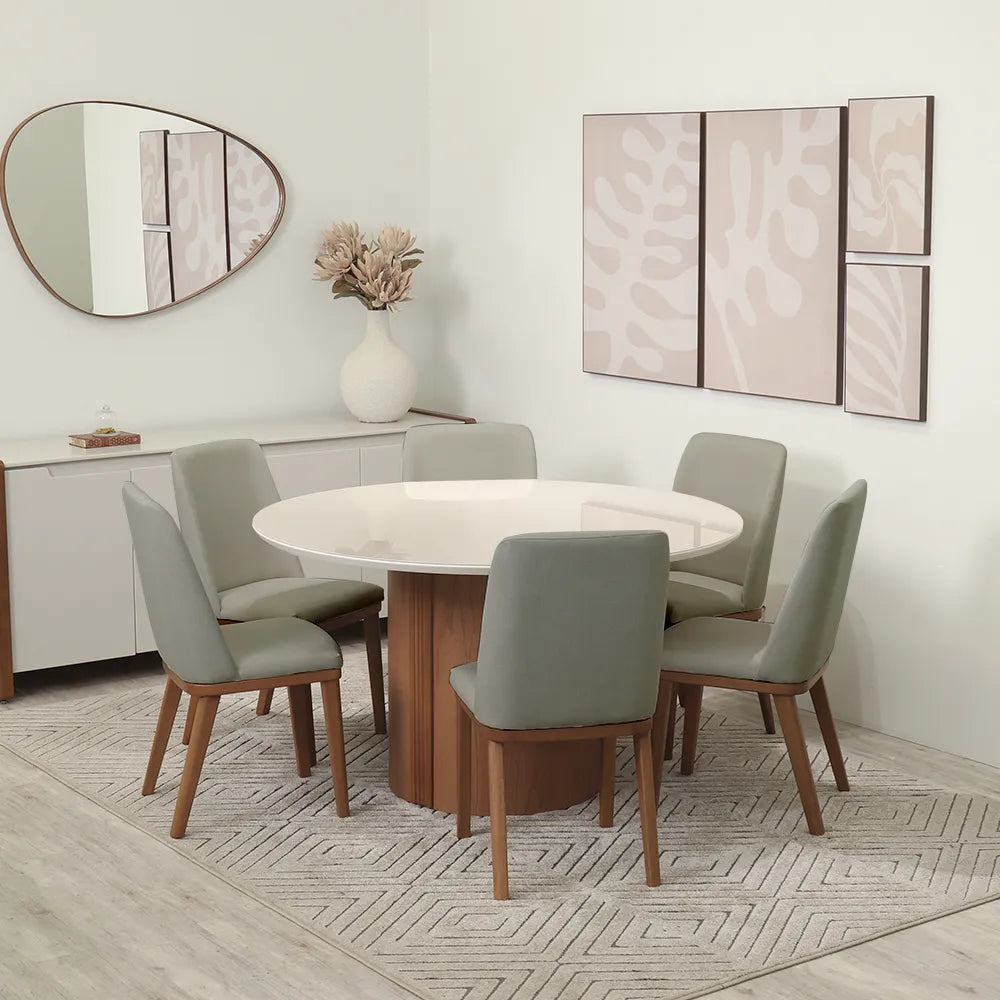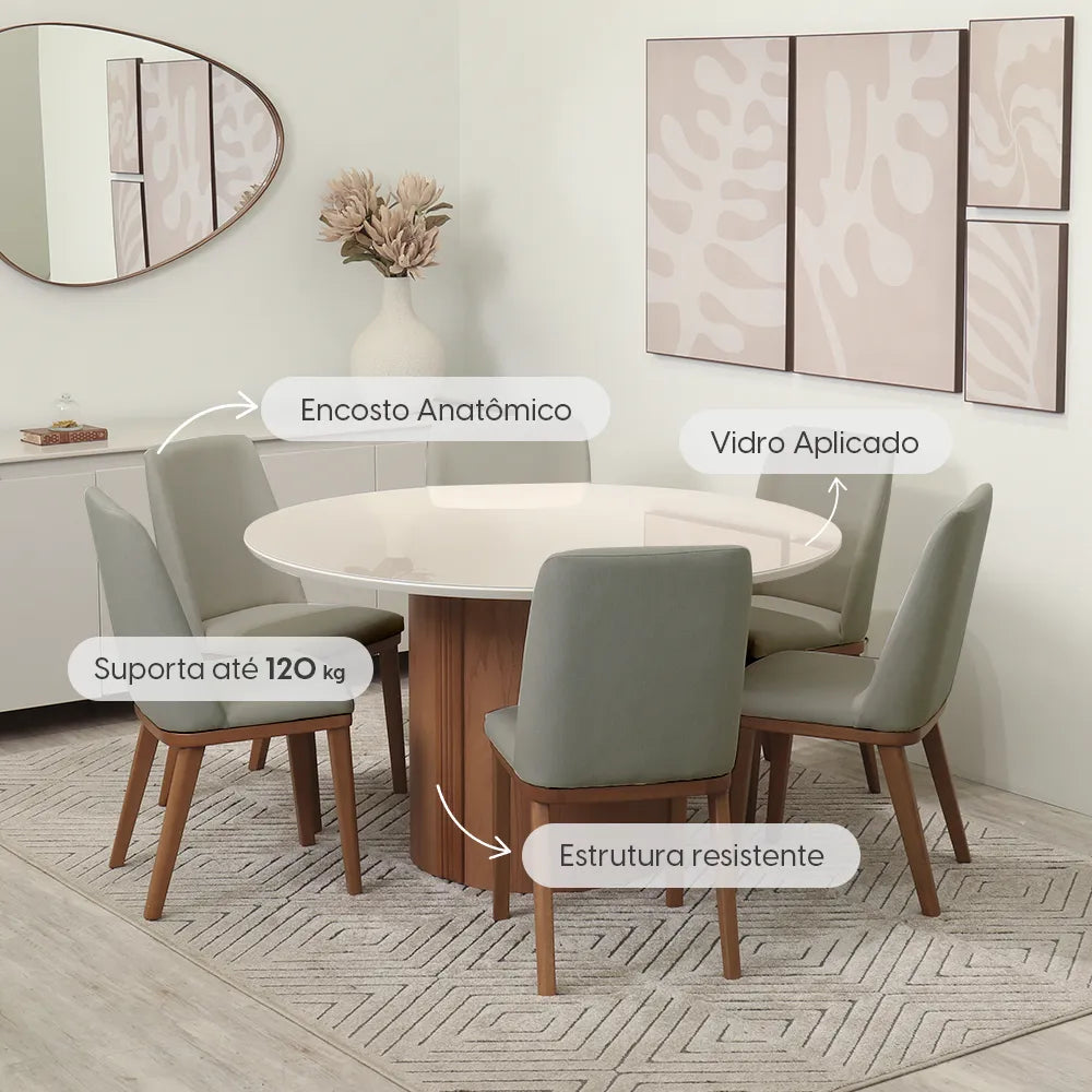 Receba seus convidados ou aproveite as refeições diárias com muito mais conforto e praticidade! O conjunto de jantar Kalina une design funcional e detalhes pensados para o dia a dia. A mesa redonda, para até seis lugares, tem tampo com bordas arredondadas e vidro aplicado, garantindo um visual leve e moderno. Sua base central, com acabamento impecável e detalhe ripado em madeira maciça, é estável e se adapta bem a diferentes espaços, como cozinhas e salas de jantar. As cadeiras acompanham o mesmo conceito, com assentos estofados e encostos anatômicos que proporcionam conforto prolongado. Com pés de madeira maciça e revestimento resistente, elas são a escolha ideal para deixar suas refeições mais aconchegantes. Seja para um café da manhã descontraído ou um jantar especial, o conjunto Kalina combina praticidade e estilo para tornar cada encontro ao redor da mesa ainda melhor!