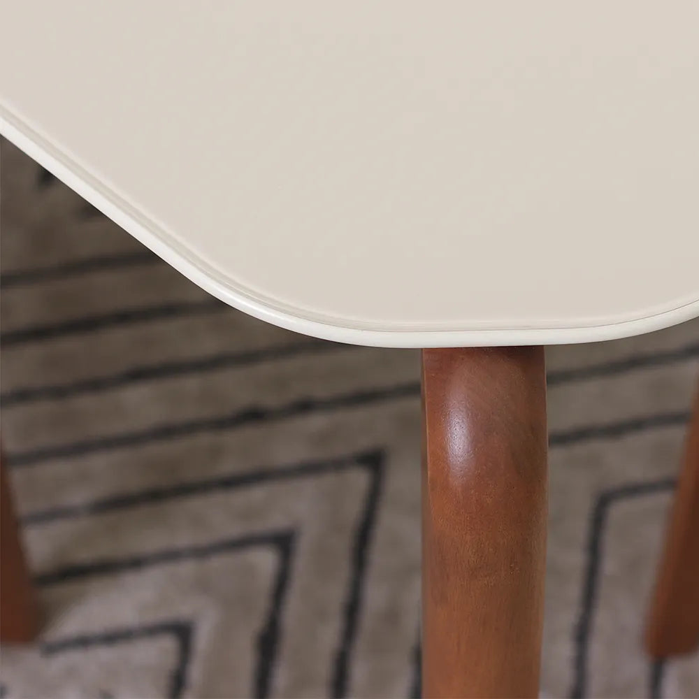 Tampo com borda arredondada, de MDF usinado 40 mm com acabamento em verniz PU fosco. Vidro aplicado sobre o tampo de 3 mm.