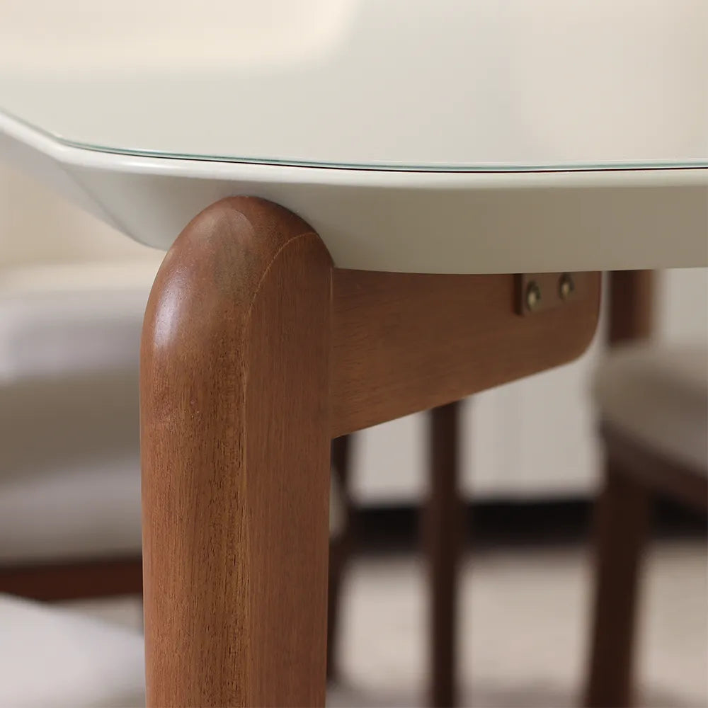 Pés usinados em madeira maciça com acabamento em pintura PU de alta resistência e sapatas de proteção.