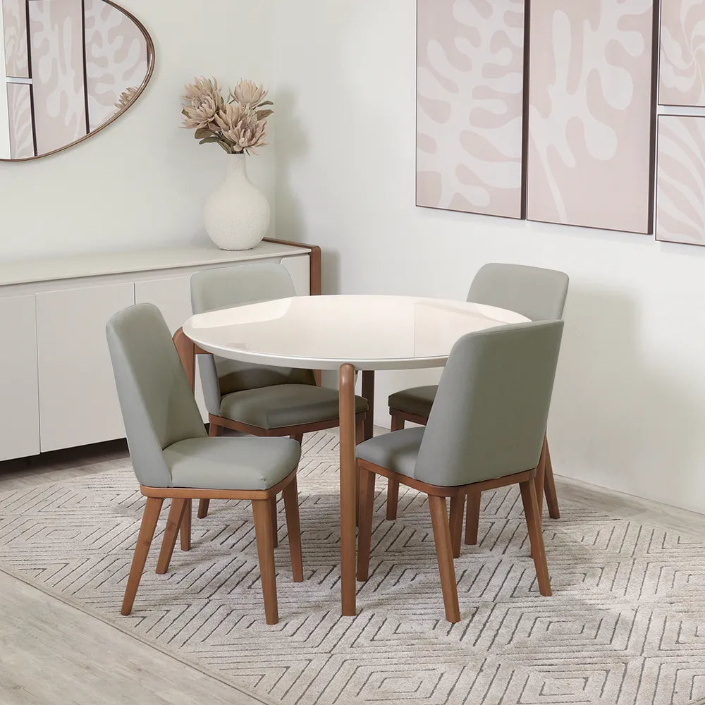 Aproveite cada refeição com mais conforto e estilo! A mesa redonda Donatella com as quatro cadeiras Kalina são ideais para otimizar espaços e criar um ambiente acolhedor na sala de jantar ou cozinha.