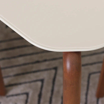 Pés usinados em madeira maciça com pintura PU e sapatas plásticas para proteção.