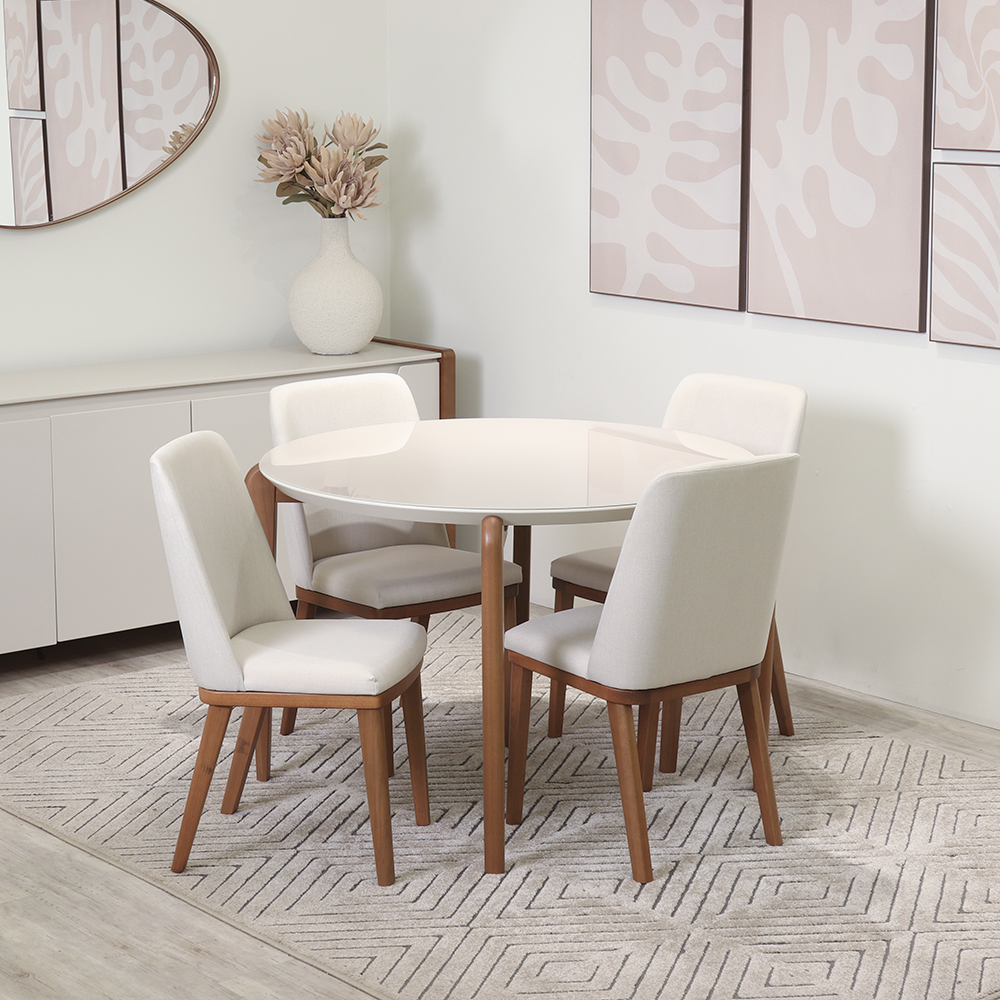 Aproveite cada refeição com mais conforto e estilo! A mesa redonda Donatella com as quatro cadeiras Kalina são ideais para otimizar espaços e criar um ambiente acolhedor na sala de jantar ou cozinha.