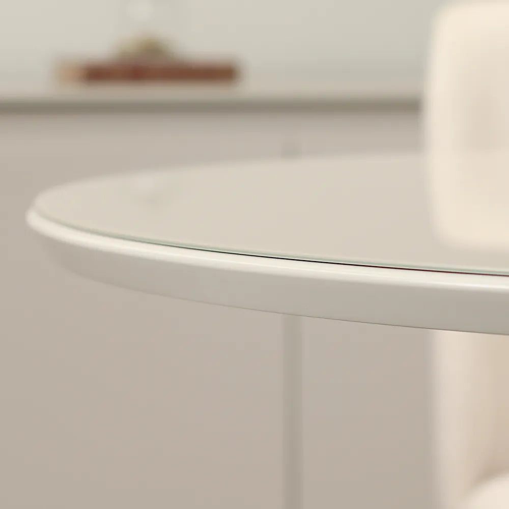 Tampo com bordas arredondadas, de MDF usinado 25 mm com acabamento em pintura UV fosca. Vidro aplicado sobre o tampo de 3 mm.