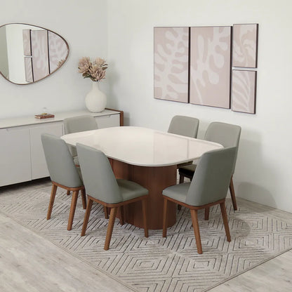 Receba seus convidados ou aproveite as refeições diárias com muito mais conforto e praticidade! O conjunto de jantar Kalina une design funcional e detalhes pensados para o dia a dia. A mesa retangular, para até seis lugares, tem tampo com bordas arredondadas e vidro aplicado, garantindo um visual leve e moderno. Sua base central, com acabamento impecável e detalhe ripado em madeira maciça, é estável e se adapta bem a diferentes espaços, como cozinhas e salas de jantar. As cadeiras acompanham o mesmo conceito, com assentos estofados e encostos anatômicos que proporcionam conforto prolongado. Com pés de madeira maciça e revestimento resistente, elas são a escolha ideal para deixar suas refeições mais aconchegantes. Seja para um café da manhã descontraído ou um jantar especial, o conjunto Kalina combina praticidade e estilo para tornar cada encontro ao redor da mesa ainda melhor!
