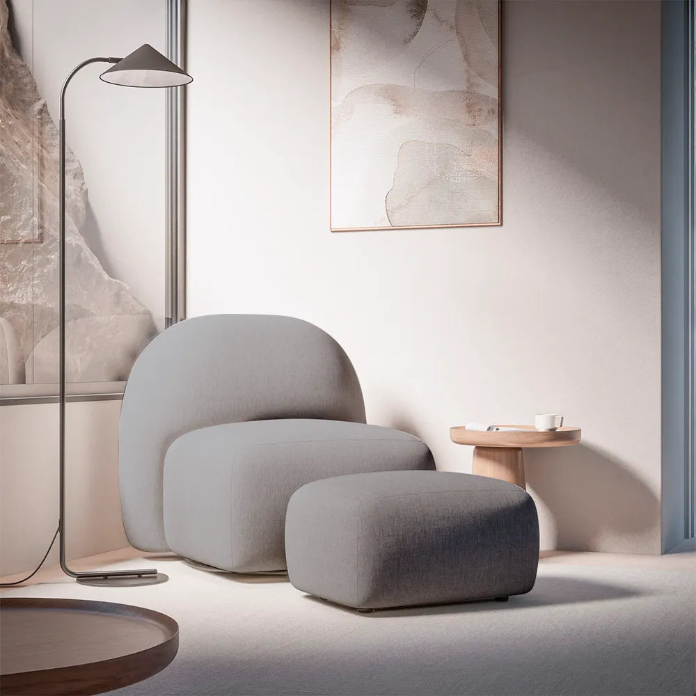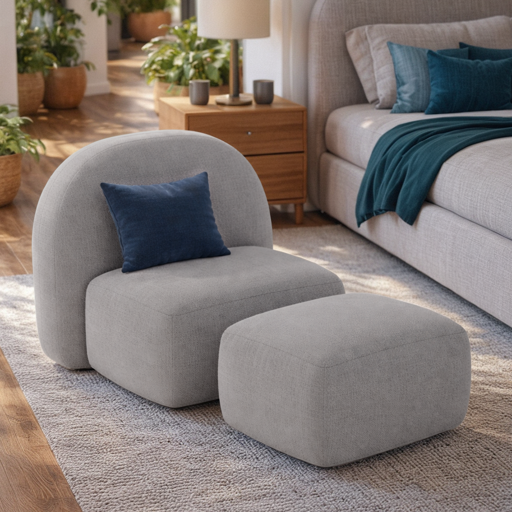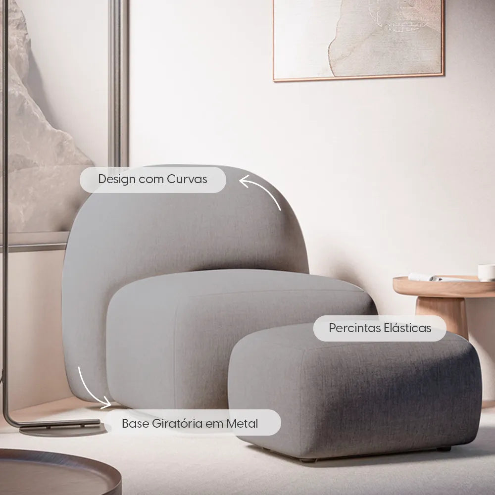 Transforme suas pausas em momentos de bem-estar com a Poltrona Giratória Aurora e seu puff, ideais para salas, quartos ou cantos de leitura.
