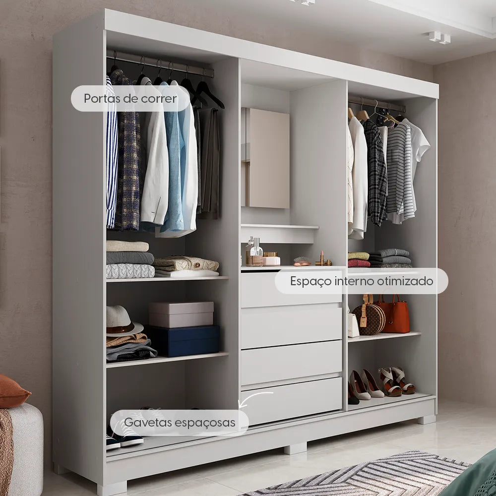 Guarda-Roupa Casal com Espelho 2 Portas de Correr 4 Gavetas Finley 184 cm - Branco