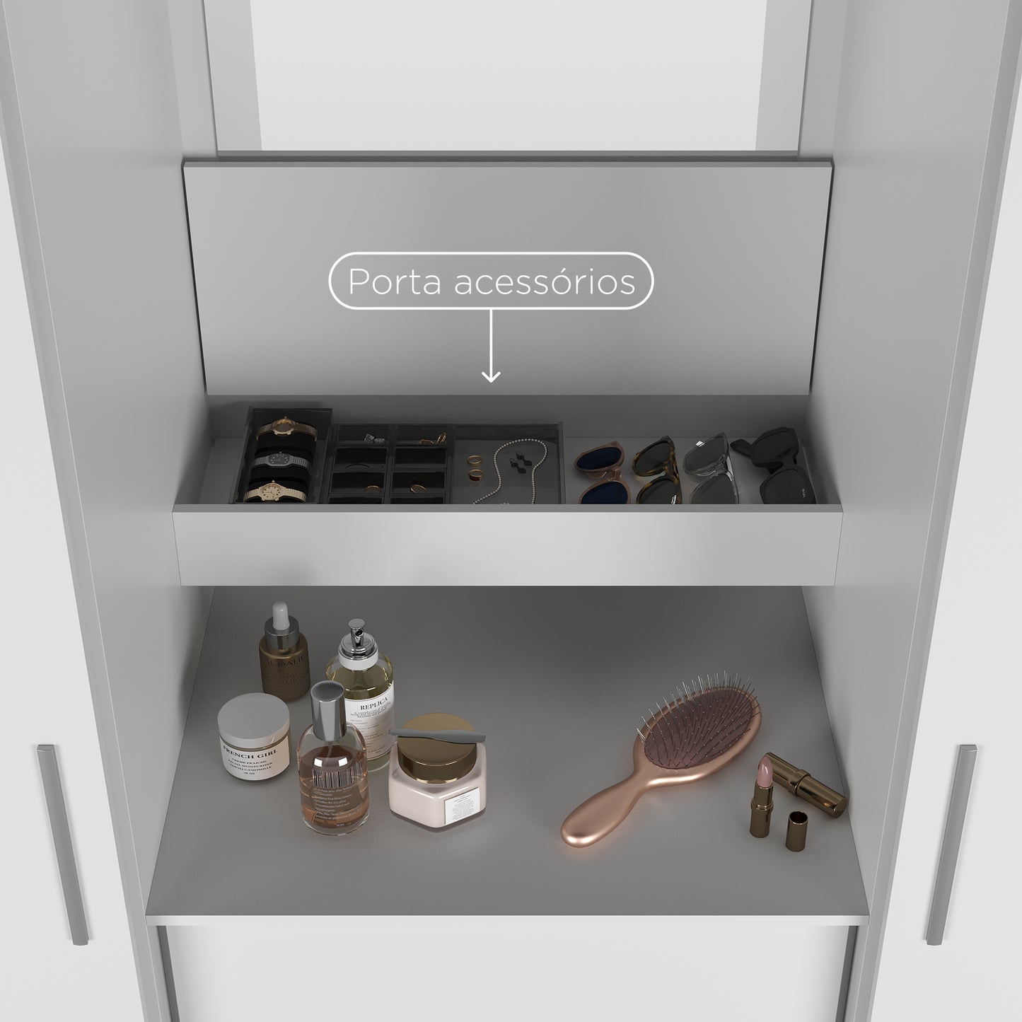 Para quem busca mais funcionalidade no quarto, o Guarda-Roupa Finley com porta-joias, espelho e gavetas criam um espaço ideal para apoiar itens pessoais e cuidar da rotina com praticidade.