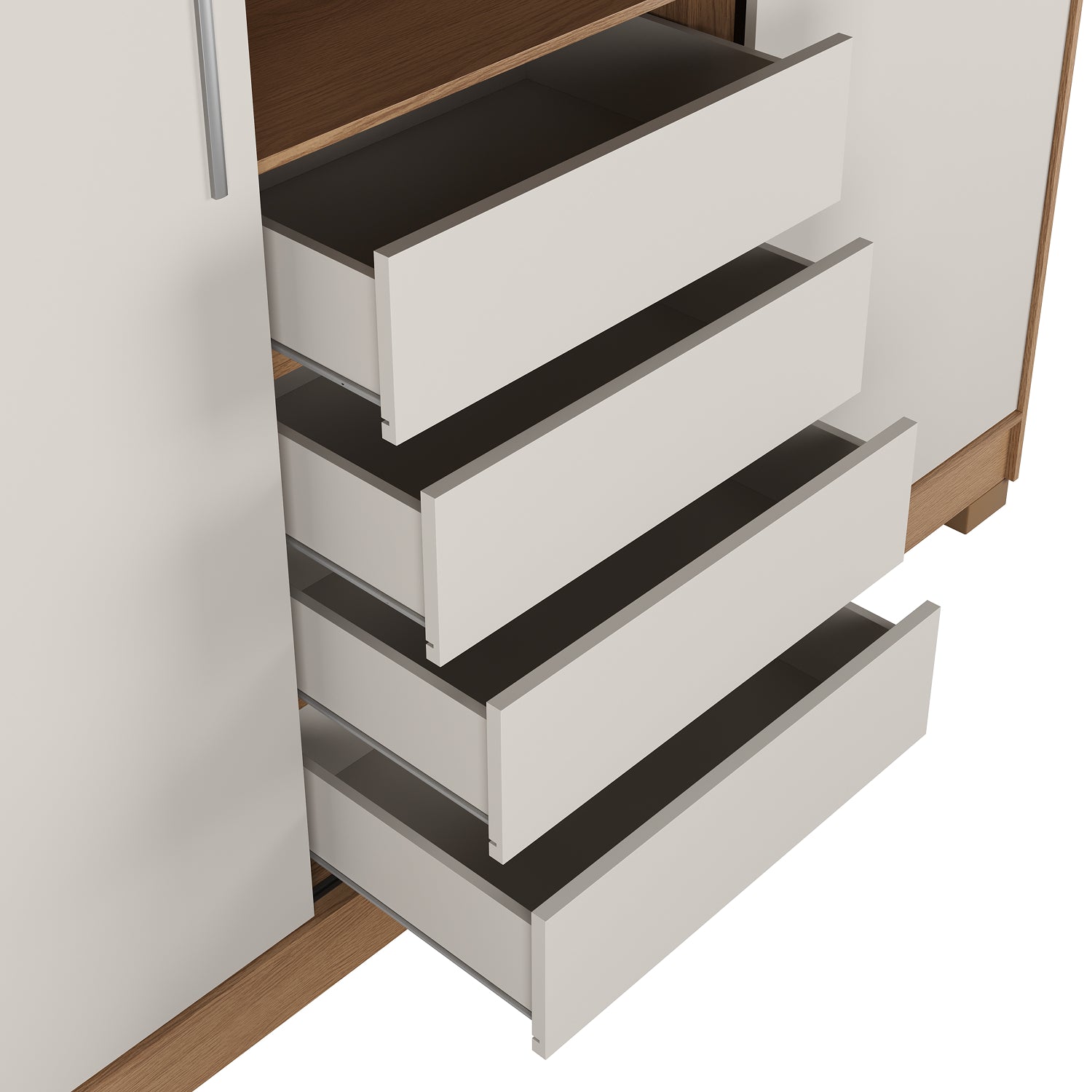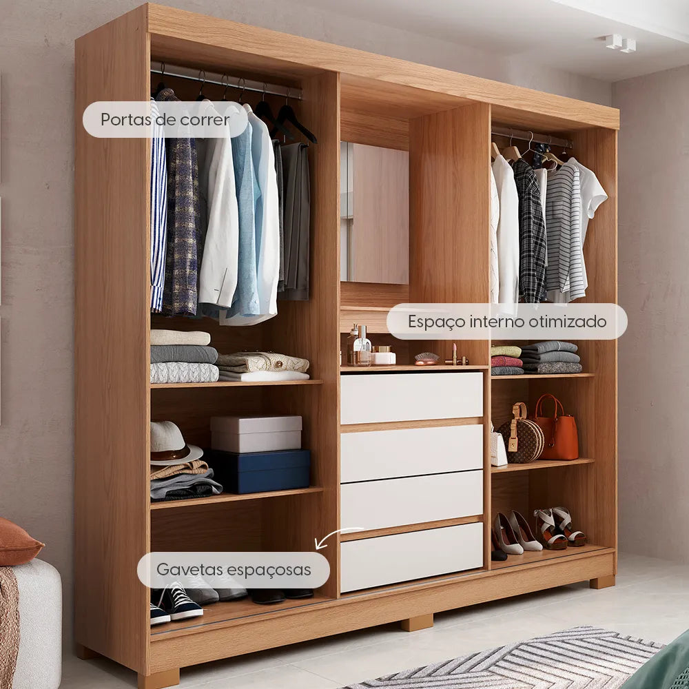 Guarda-Roupa Casal com Espelho 2 Portas de Correr 4 Gavetas Finley 184 cm - Carvalho c/ Off White