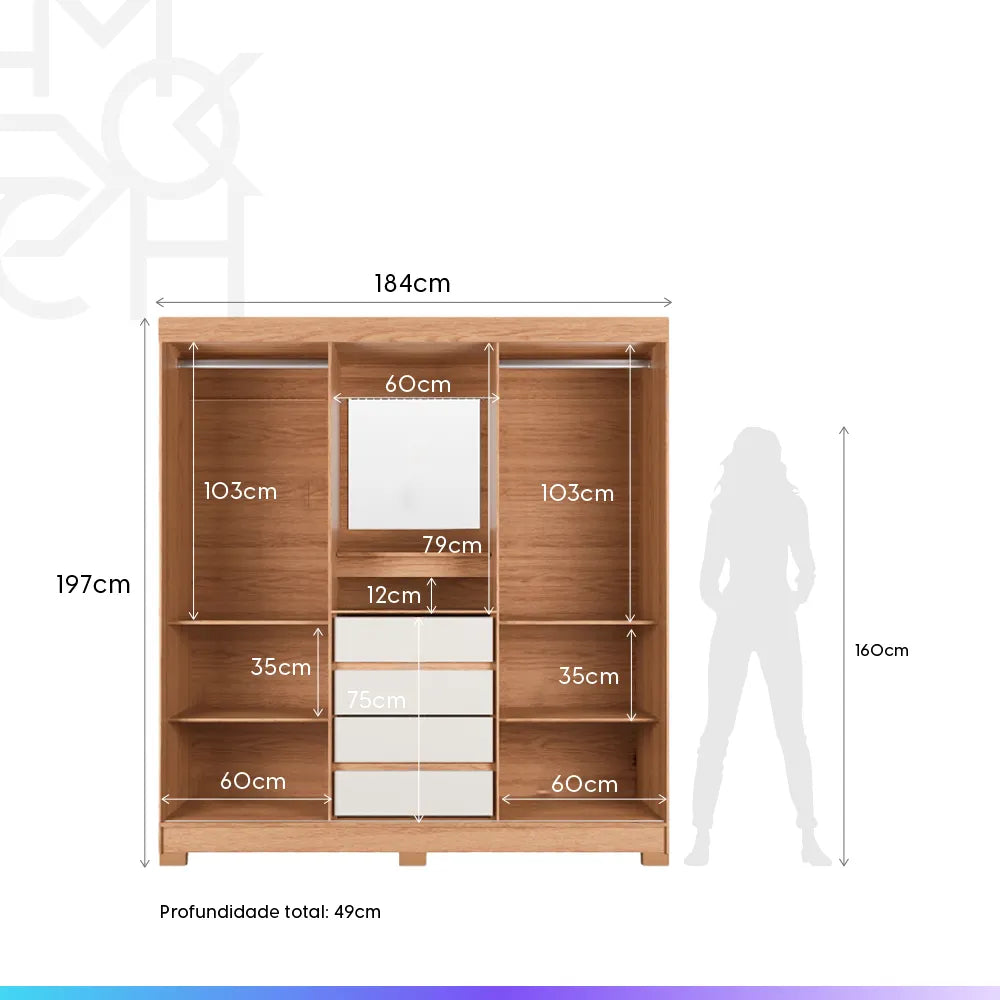O Guarda-Roupa Finley é a escolha certa para quem busca organização com um visual moderno. Suas portas de correr otimizam o espaço, enquanto o espelho central, posicionado acima das gavetas, remete ao visual de uma penteadeira, perfeito para a rotina diária. O modelo conta com nichos, prateleiras, gavetas e um porta-joias, ideal para guardar roupas, acessórios e objetos pessoais. Os cabideiros de alumínio mantêm tudo sempre bem organizado e a base com pés discretos ajuda a preservar o piso e manter uma estrutura firme. O acabamento fosco completo ou design contemporâneo. Ideal para quartos de casal ou suítes, o roupeiro Finley tem funcionalidade com bom aproveitamento de espaço.
