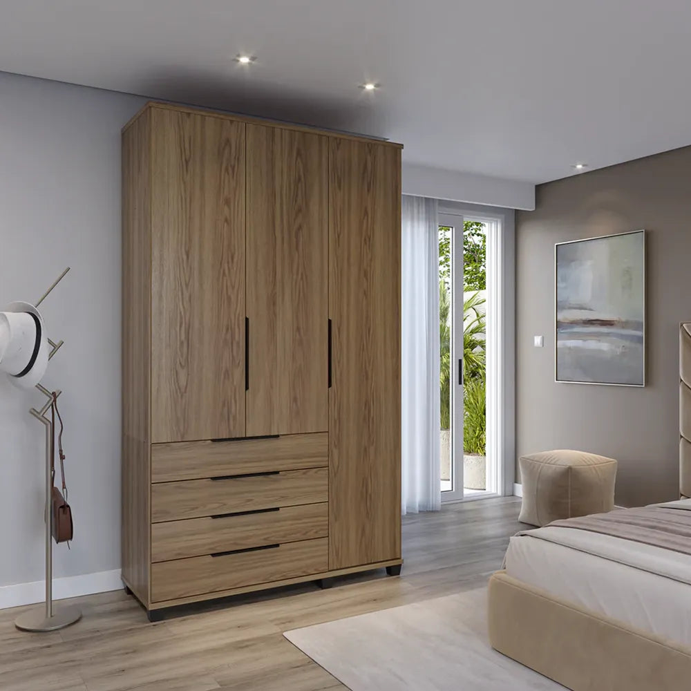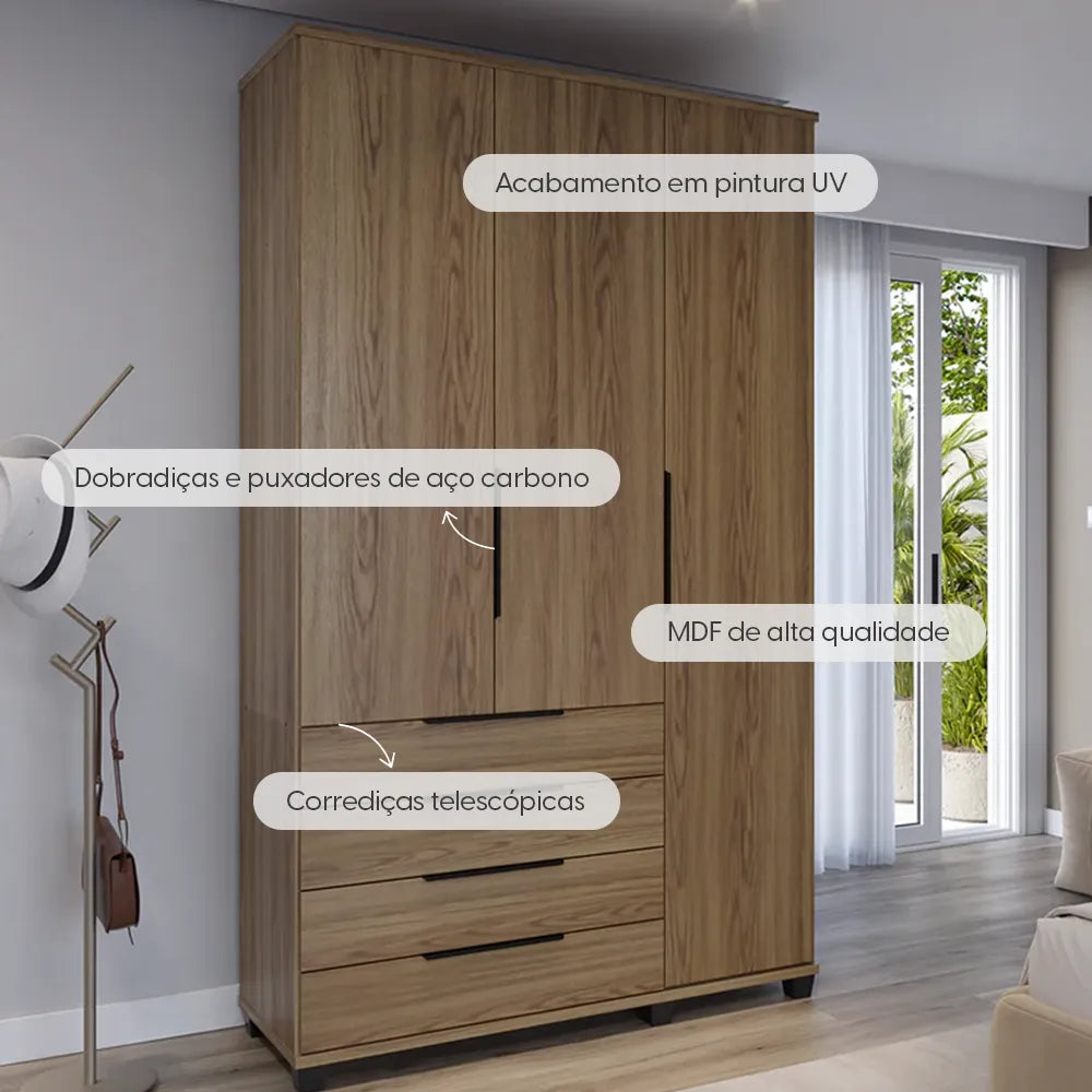 Com espaço interno bem dividido, o roupeiro com 3 portas e puxadores de metal, se torna ideal para organizar todos os seus pertences mais importantes! O modelo Allen possui 4 gavetas amplas que acomodam suas peças dobradas com 100% de aproveitamento, um espaço de cabideiro para manter suas roupas penduradas e livre de amassados, conta ainda com 5 nichos e um maleiro superior, perfeito para acomodar roupas de cama, sapatos e outros acessórios. Agregando um visual elegante ao seu quarto ou dormitório, o item é perfeito para quem busca um móvel versátil com ampla capacidade de armazenamento e cheio de personalidade. Desenvolvido em 100% MDF de alta qualidade com acabamento em verniz e pintura UV, que garantem a durabilidade e sofisticação do móvel. Os puxadores em metal adicionam um toque moderno, combinando praticidade ao design refinado do Guarda-Roupa Allen. Transforme seu espaço com esta peça única e funcional, ideal para otimizar o seu ambiente com requinte.