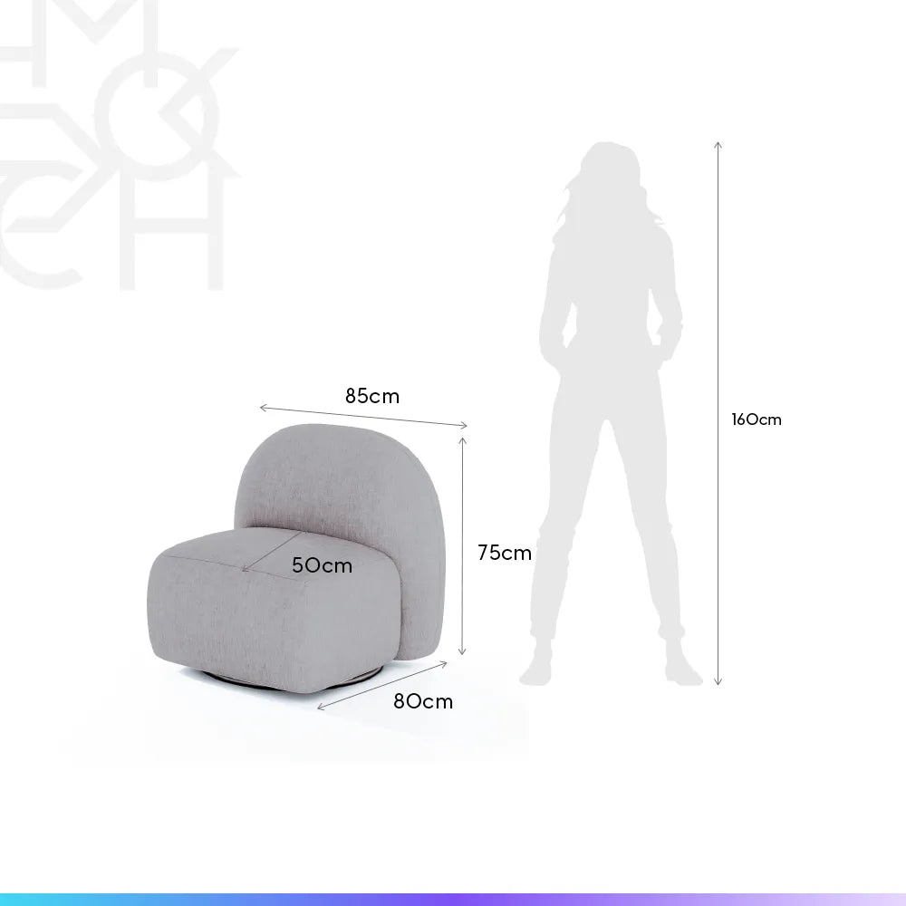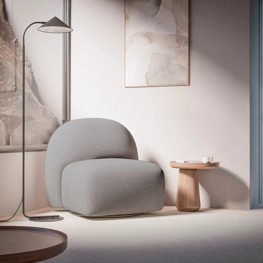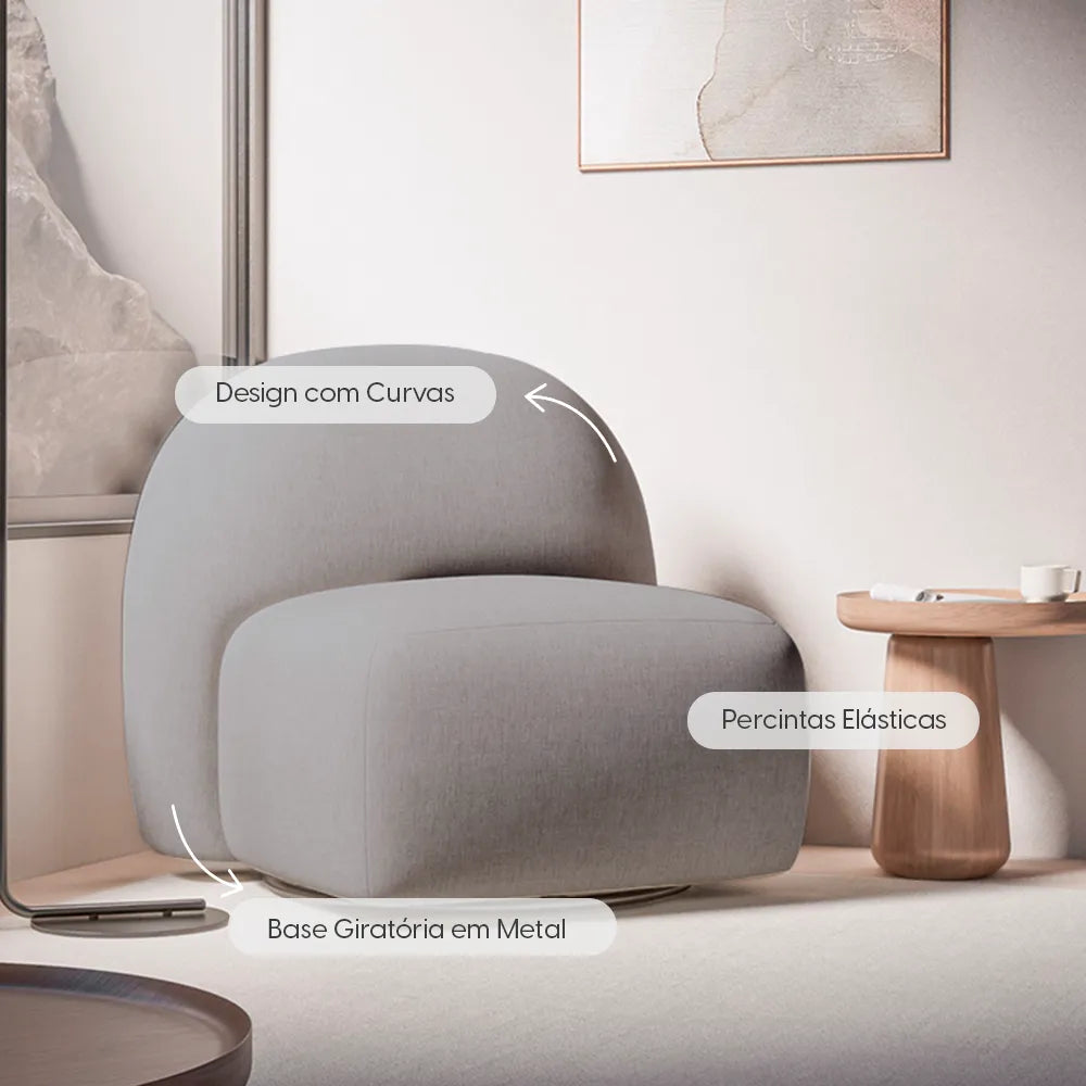 Com design curvo e base giratória, a Poltrona Aurora é ideal para compor salas e quartos com conforto e estilo.