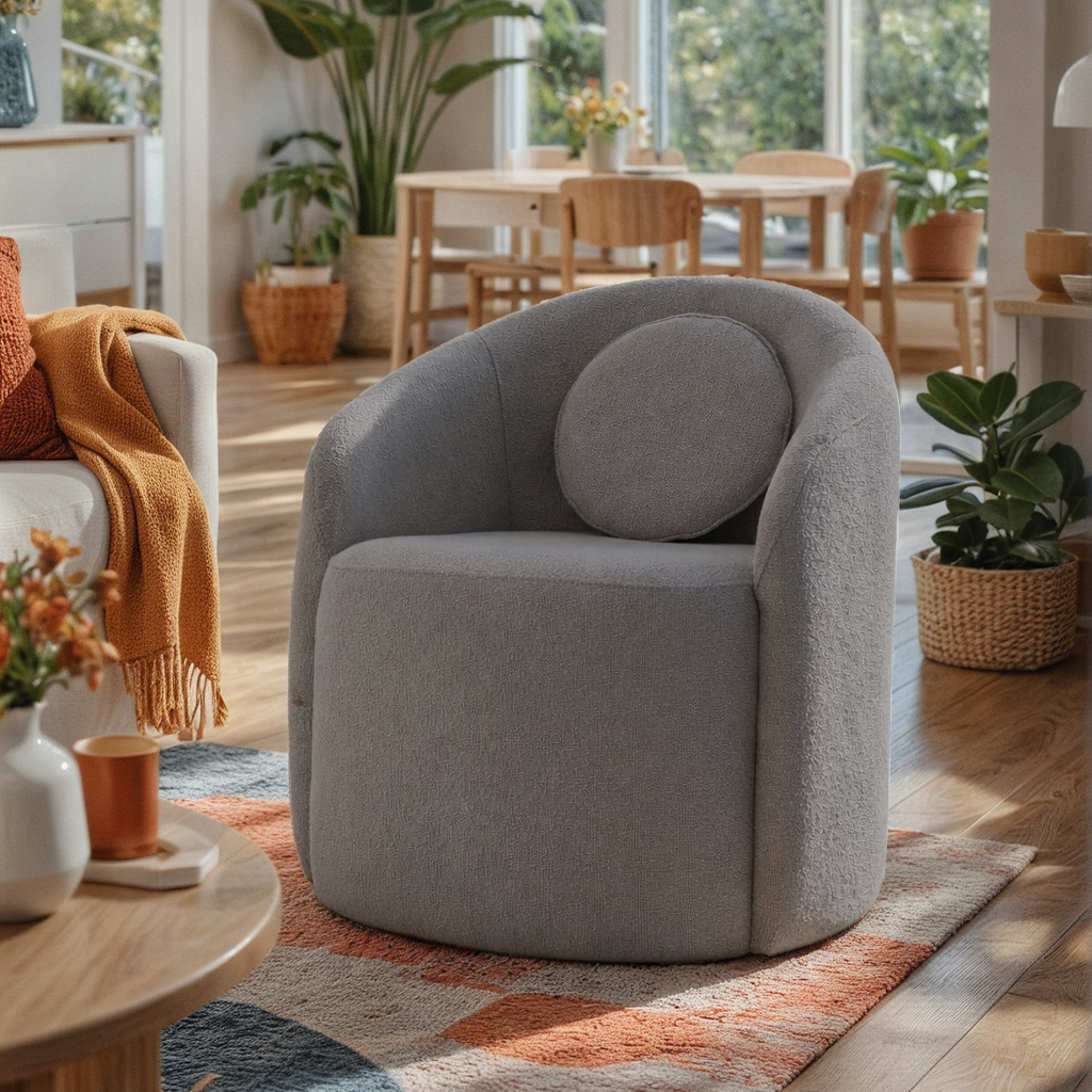 Perfeita para quem busca conforto e estilo, a poltrona giratória estofada moderna com encosto envolvente e almofada decorativa Nuvia é ideal para sala de estar, quarto ou home office.