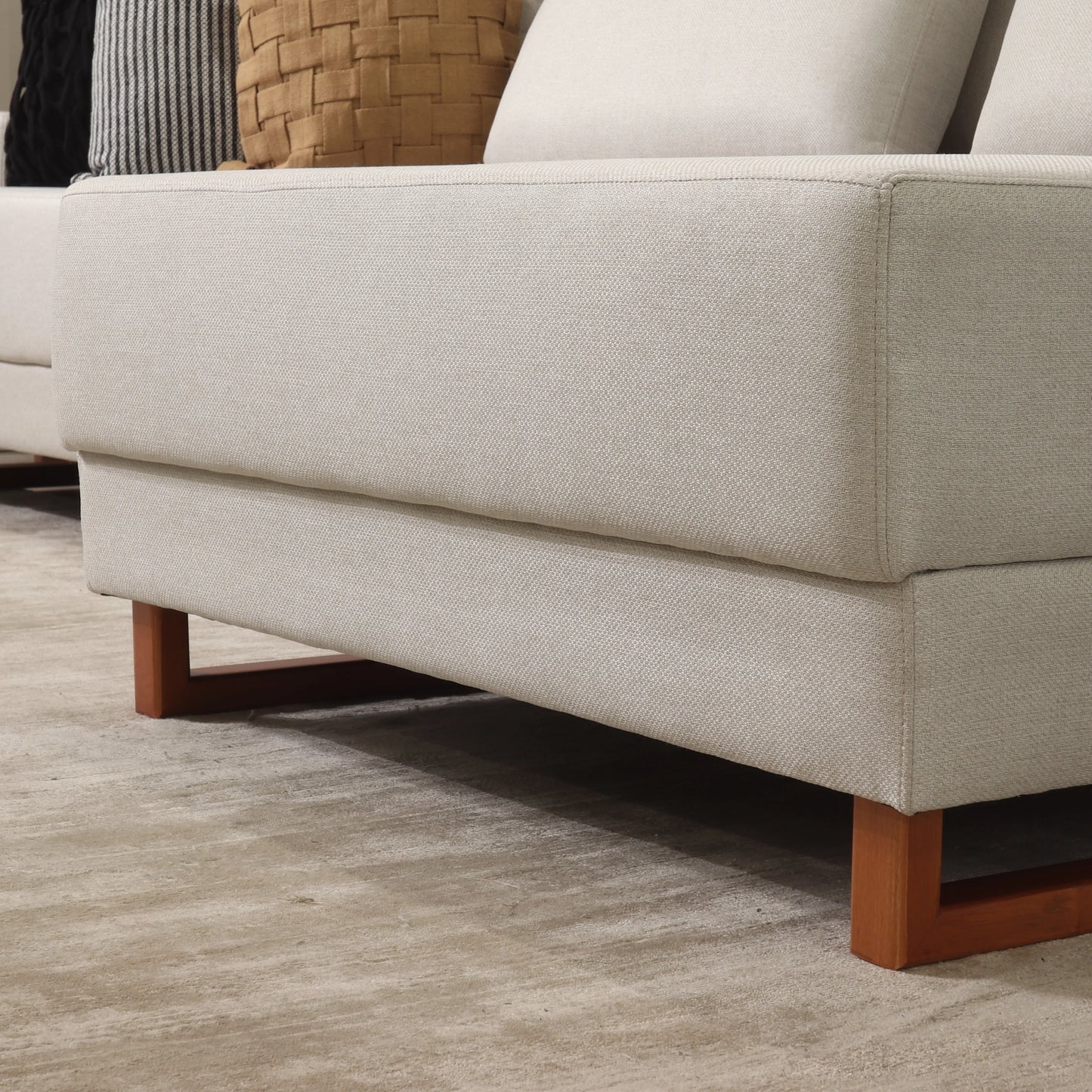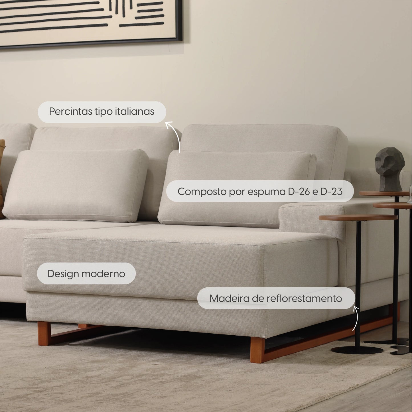 Sofá 6 Lugares com Chaise Lado Direito Mônaco 330 cm - Linho Texturizado Bege c/ Natural