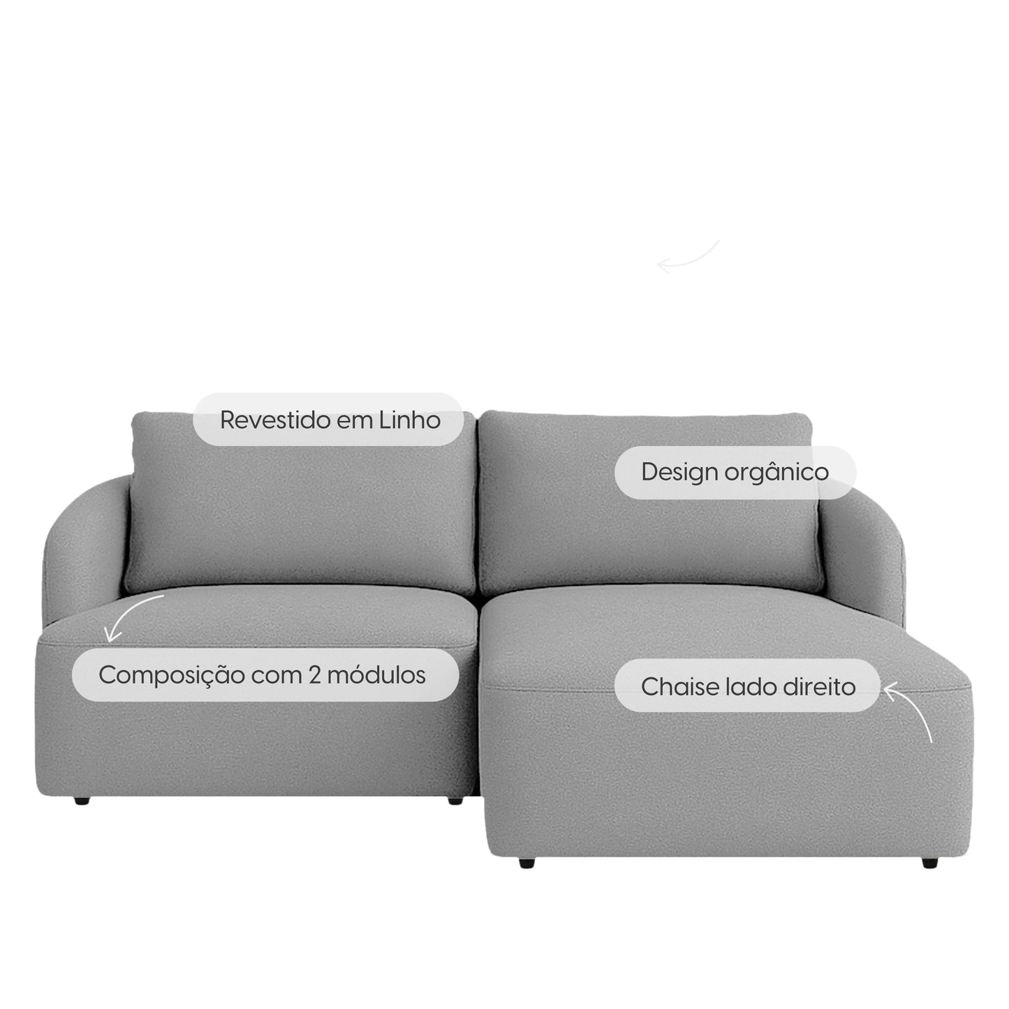Sofá Modular com Chaise Lado Direito 3 Lugares Mood 194 cm - Linho Cinza